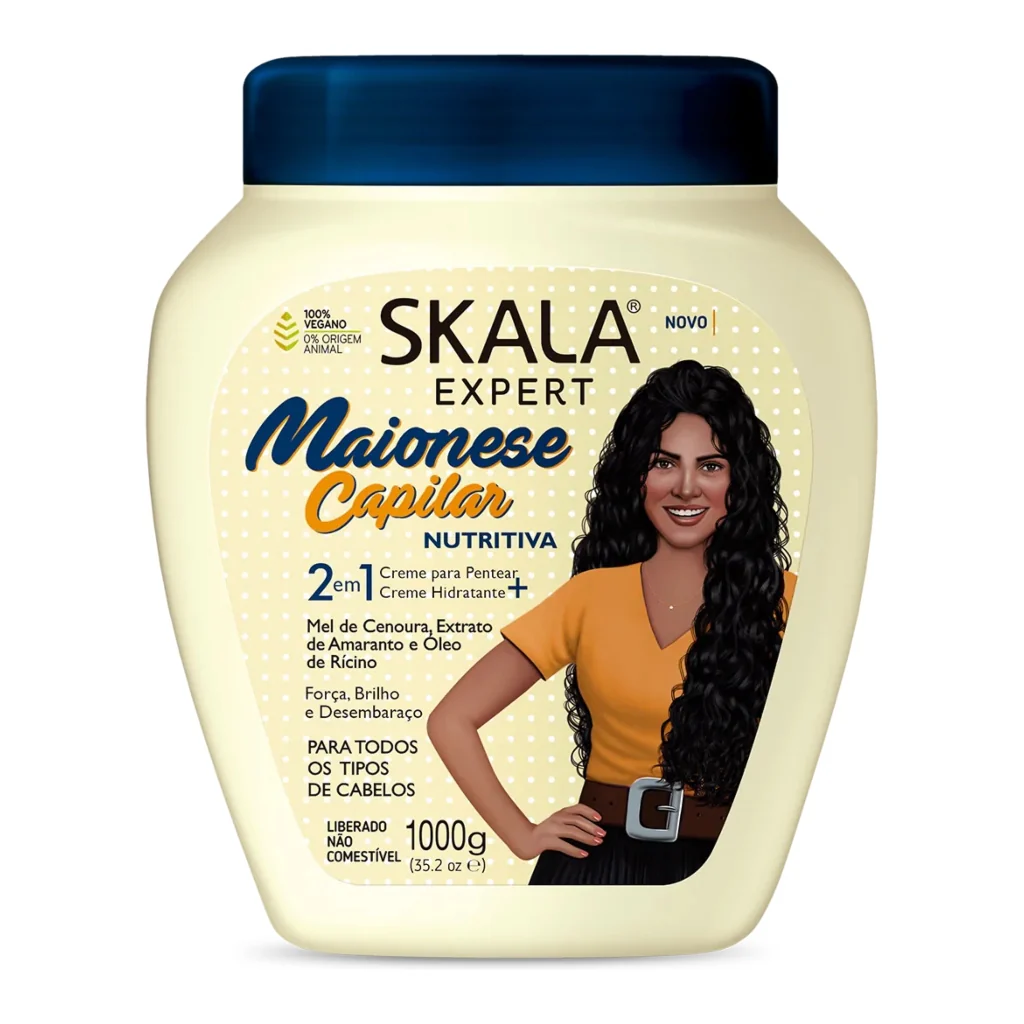 Skala Expert Maionese Capilar Nutritiva 2 en 1 combina miel de zanahoria, extracto de amaranto y aceite de ricino para proporcionar nutrición profunda.